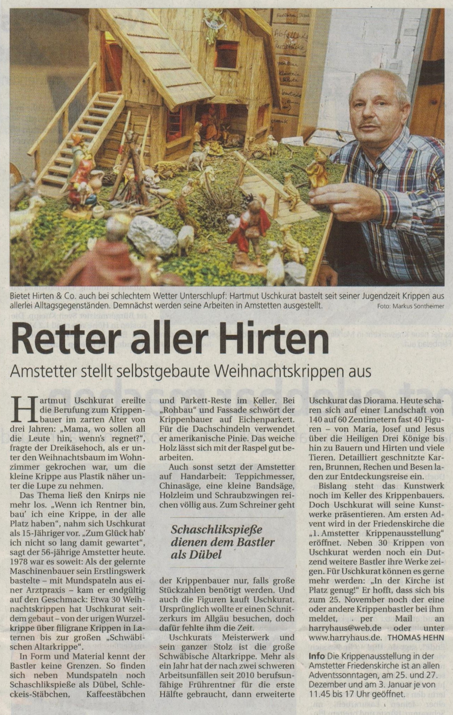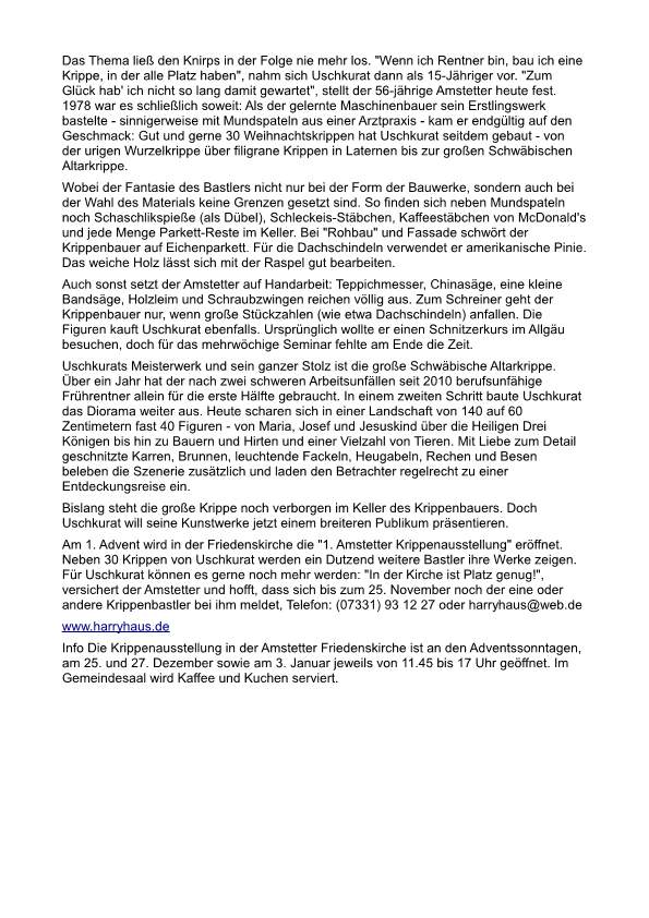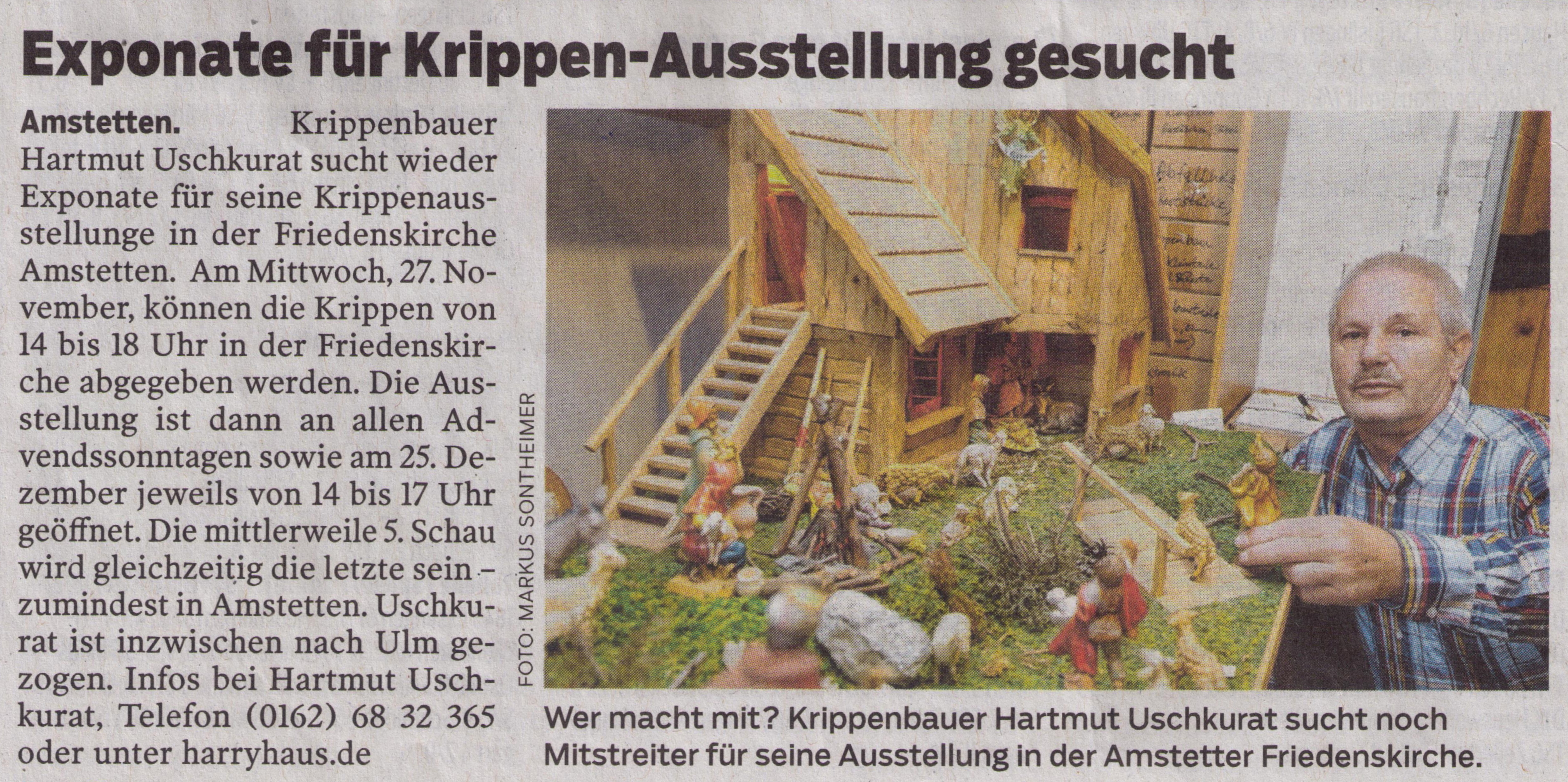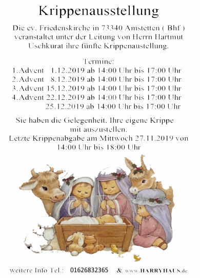 Die Ev. Kirchengemeinde Amstetten veranstaltet in der Friedenskirche in 73340 Amstetten ( Bahnhof ) unter der Leitung von Herrn Hartmut Uschkurat ihre fünfte Krippenausstellung.